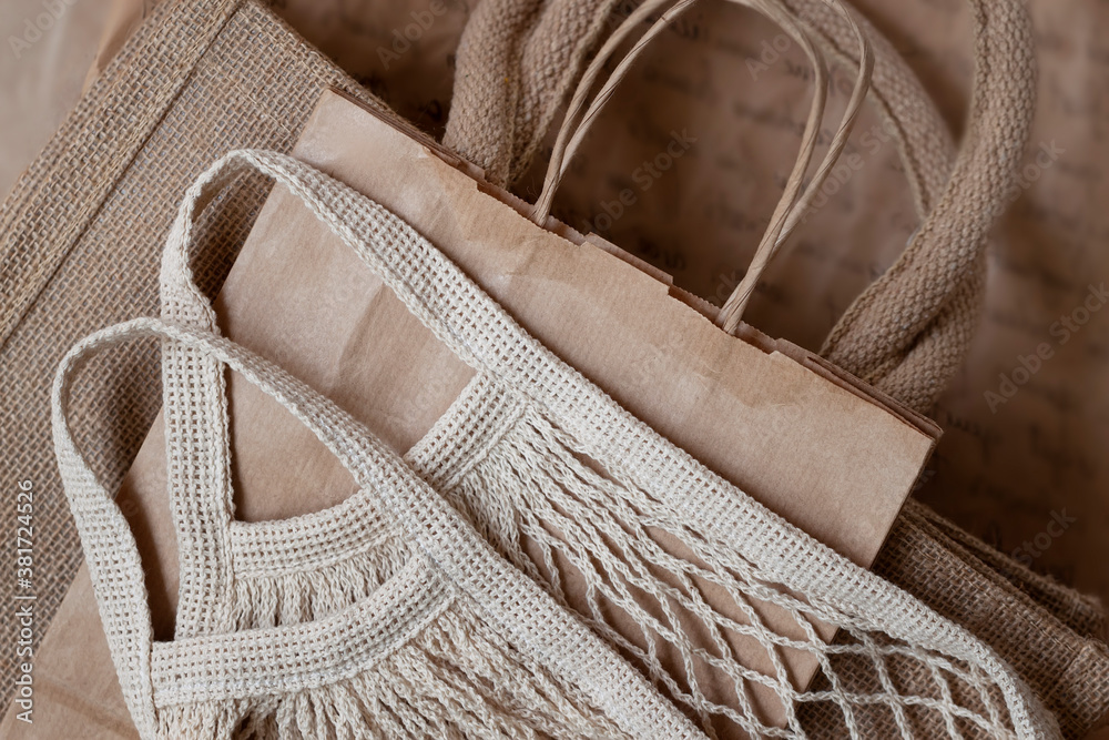 Various type of eco-friendly produce bags. Paper, burlap and mesh textile reusable grocery bags, zero waste, plastic free concept.