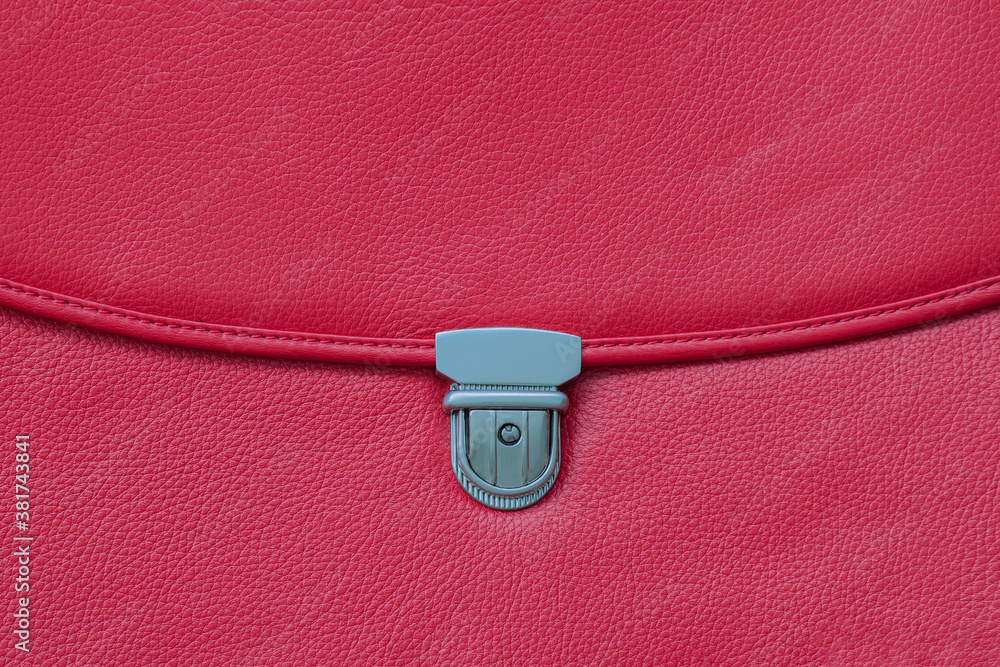 Fashionable red bag from genuine leather close-up, texture.Detail of leather briefcase, metal clasp