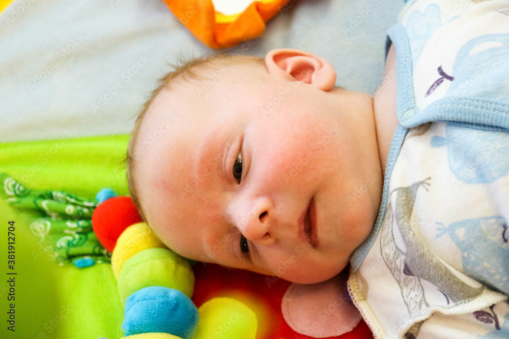 smiling happy cute child infant playing with toys on the play carpet close up baby face