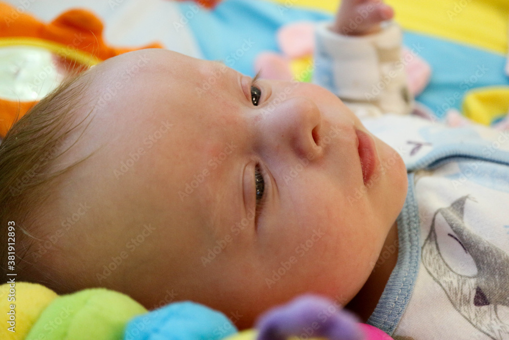 smiling happy cute child infant playing with toys on the play carpet close up baby face