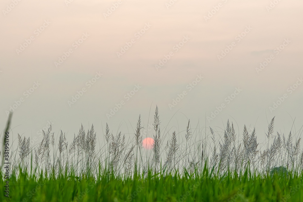 Beautiful Sunset against common reed grass canes in the fields