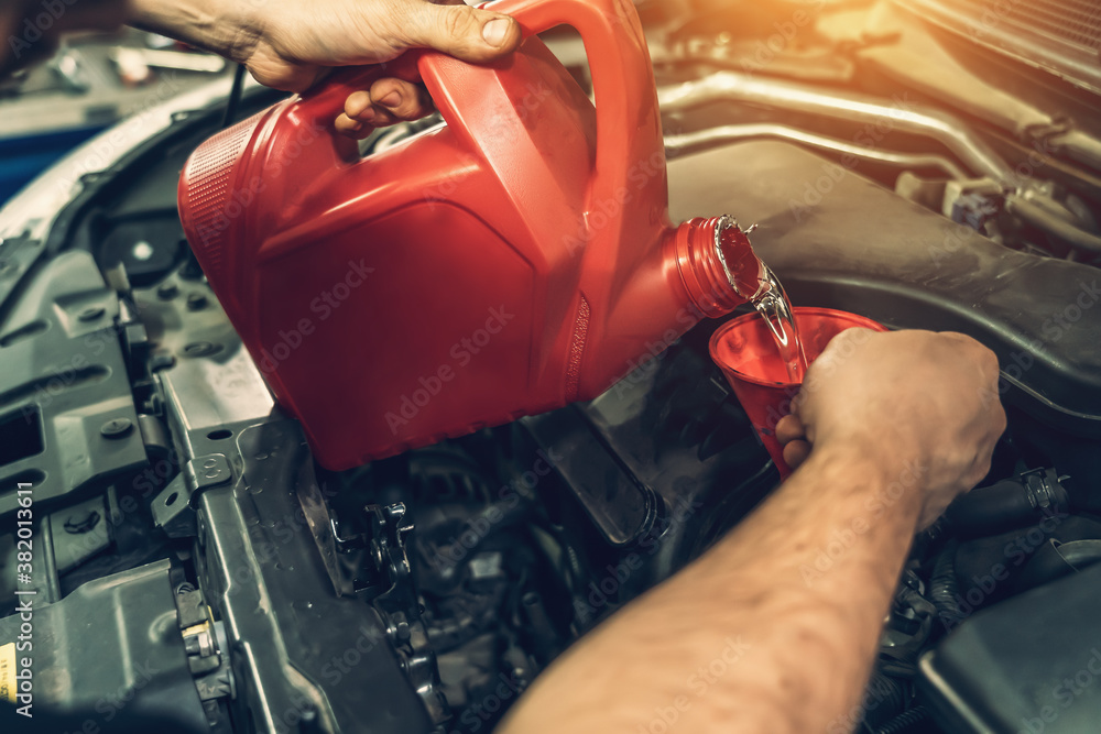Worker hands pours flushing engine oil into engine to remove carbon deposits in auto service, correct timing change in car