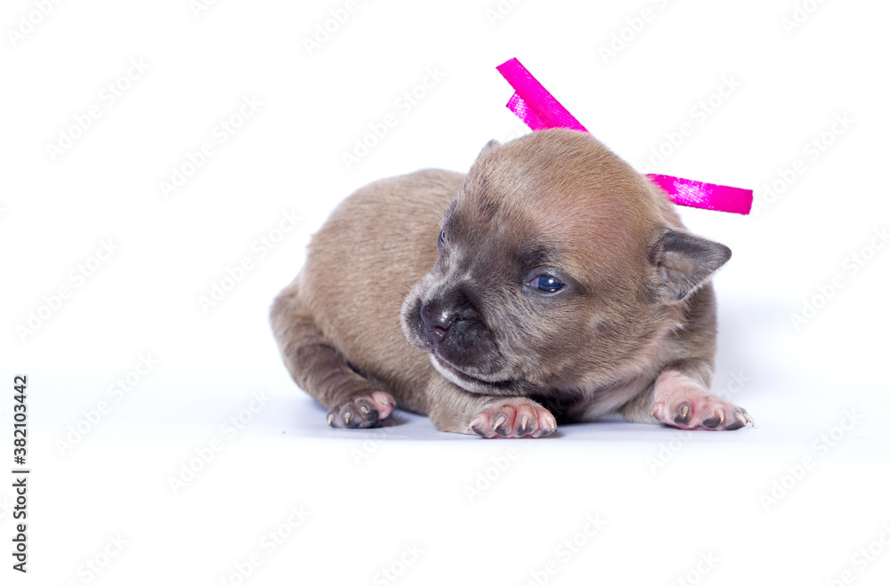 newborn puppy with pink ribbon on white background