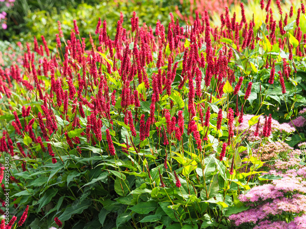 Clump of red bistort, Persicaria amplexicaulis, in a garden with red flower spikes and green leaves