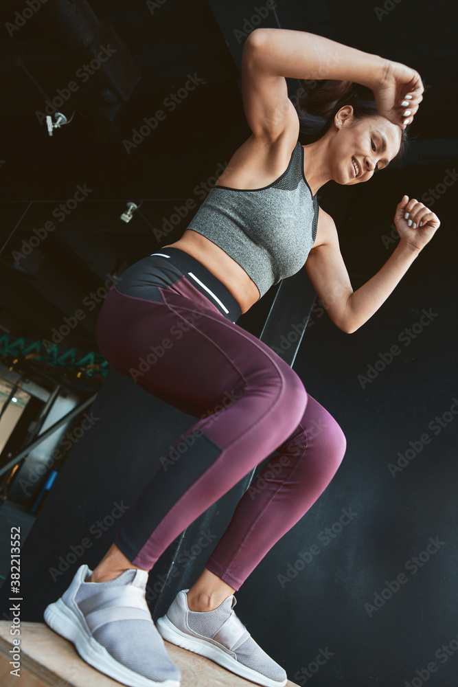Best calorie burning Exercises. Bottom view of a strong athletic woman in sportswear doing box jump while working out at industrial gym, vertical shot
