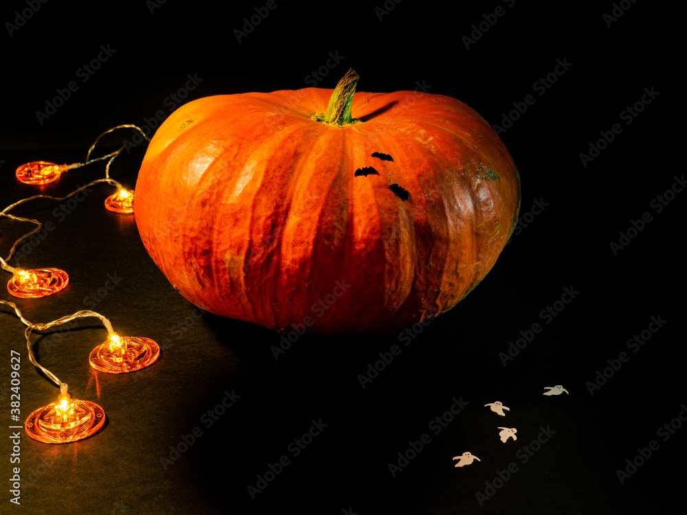 Halloween pumpkin with orange pumpkin-shaped lights and little white ghosts