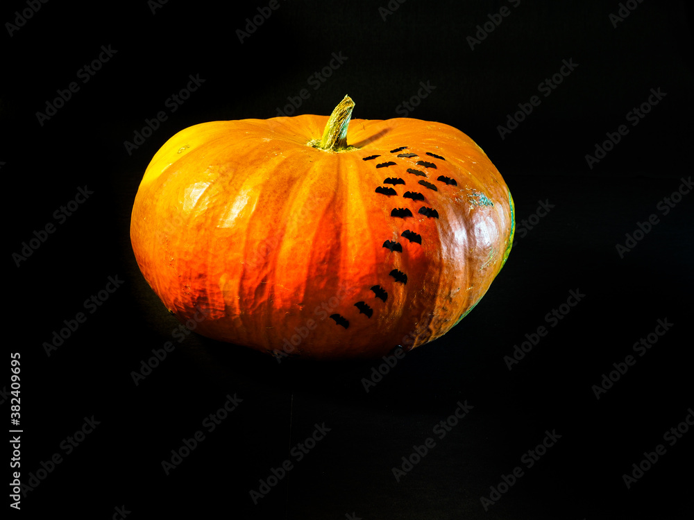 orange halloween pumpkin with black background and small bats attached to the pumpkin