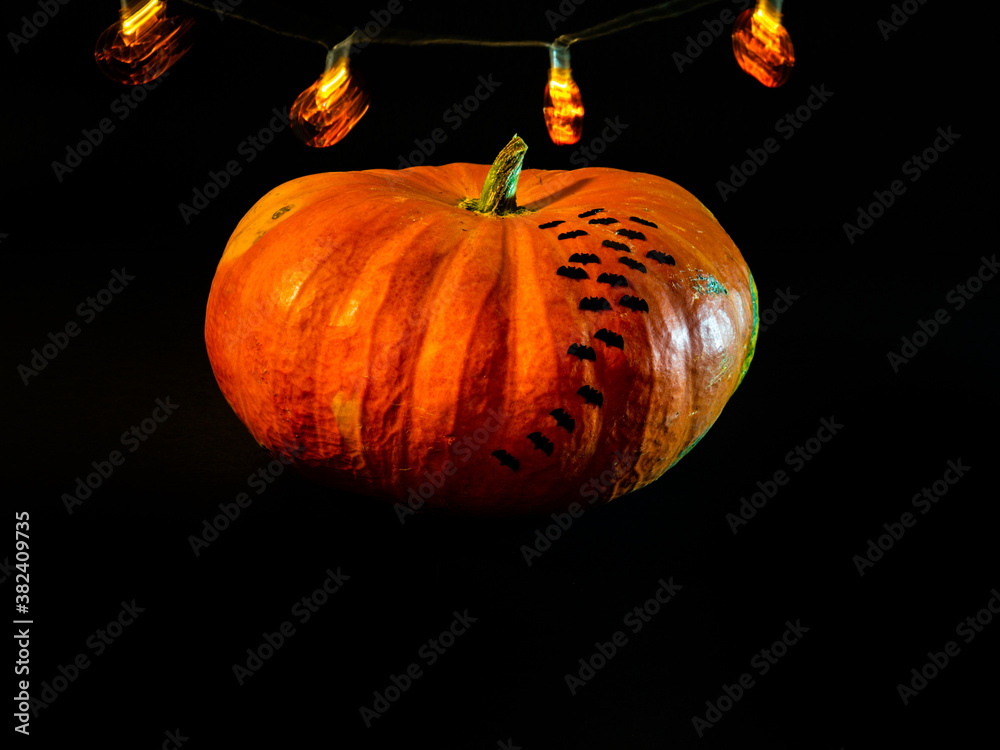 orange halloween pumpkin with black background, tiny little bats attached to the pumpkin and orange pumpkin shaped lights
