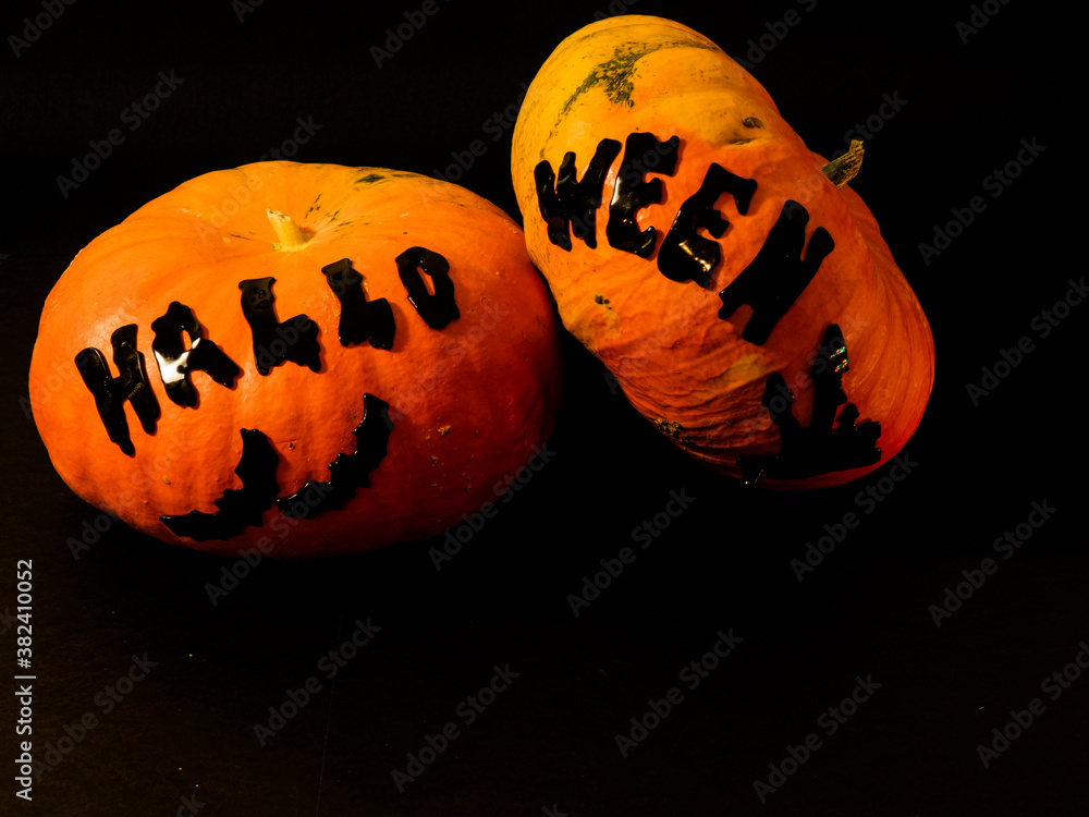 two orange halloween pumpkin with glued halloween letters and black bats glued on. terror
