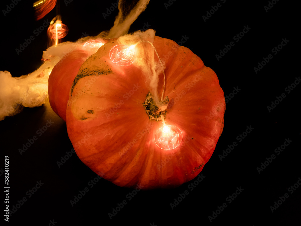 two orange halloween pumpkin with attached halloween lettering, spider webs and orange pumpkin shaped lights. terror