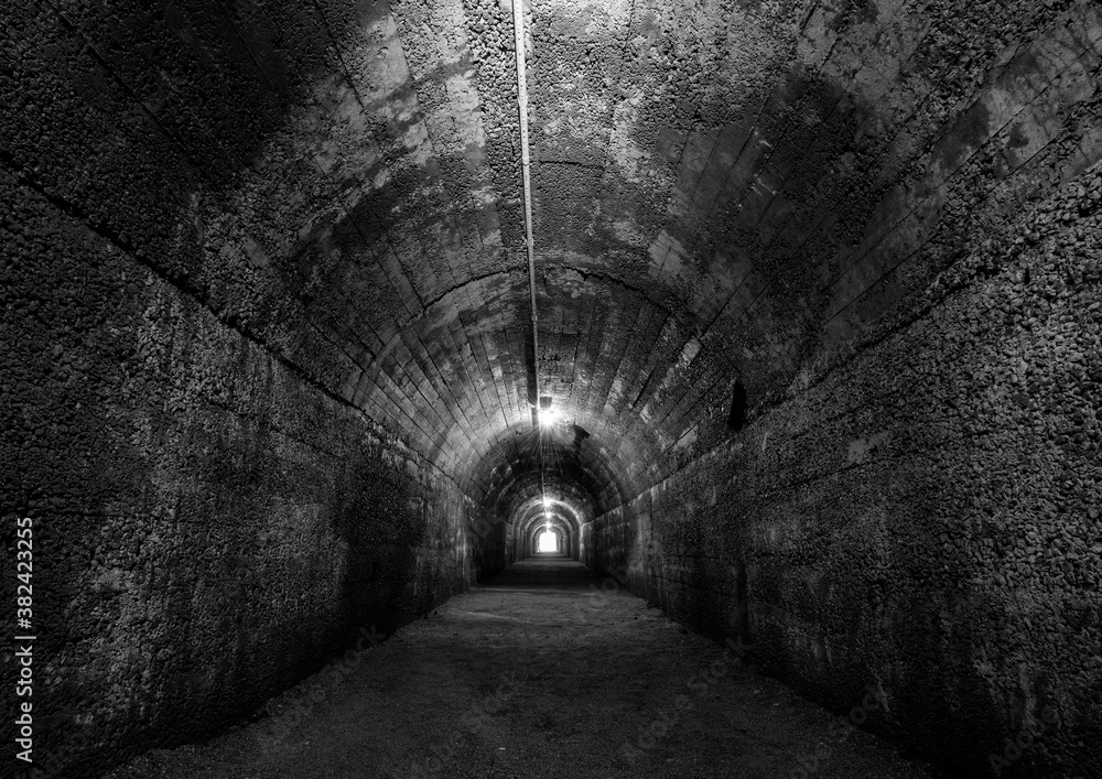 Tunnel Bunker unterirdischer Gang Dunkelheit Mine Furcht Panik Licht Beton Schutzraum Luftschutz Lost Place Stollen düster feucht Finsternis Lampe Tropfsteine Deutschland Krieg Bomben schwarz weiß