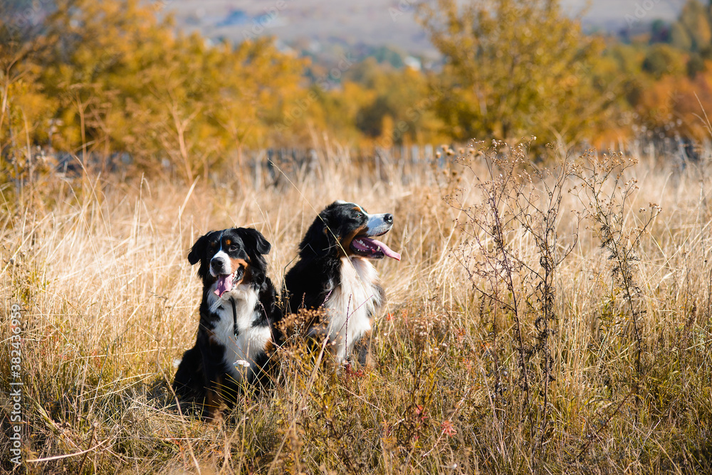 dogs of Berner Sennenhund breed, couple of themselves and a female, sit in dry grass against the background of an autumn yellowing forest