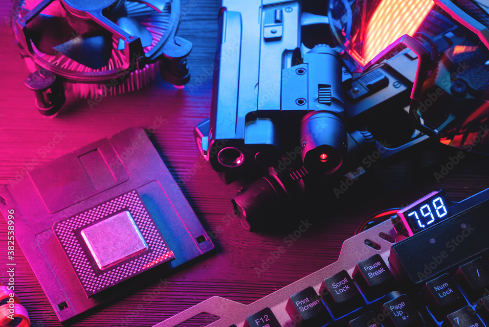 Cyberpunk concept background. Floppy disk, guns, computer keyboard, cpu chip and glasses on the black table background in neon lights.
