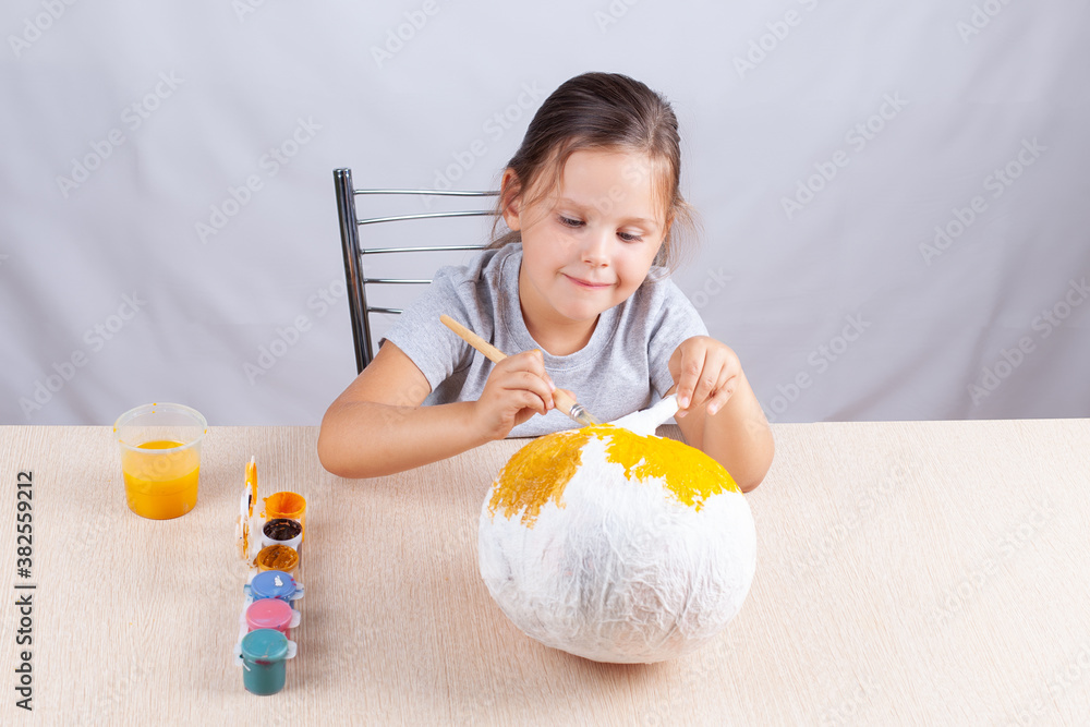 a child with pleasure and a smile decorates a homemade pumpkin for Halloween, preparing for the holiday in isolation.