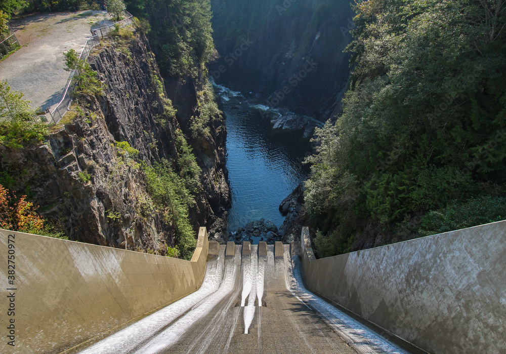 Cleveland Dam by Capilano Lake in North Vancouver, BC. The aerial view on dam and surrounding rocky cliffs.