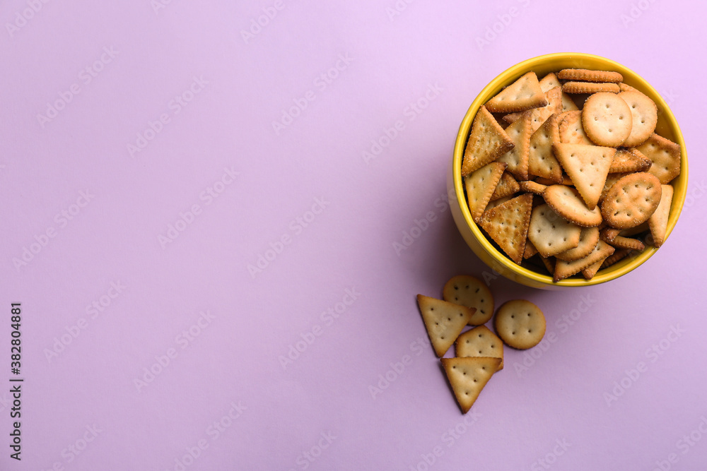 Delicious crackers in bowl on violet background, flat lay. Space for text
