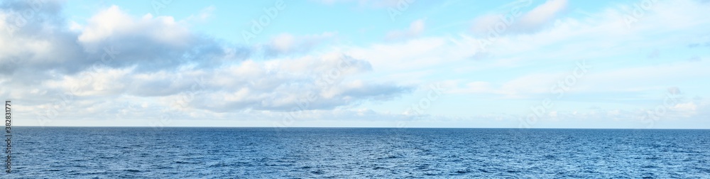 Panoramic view of the open Baltic sea with beautiful glowing sunset clouds in a clear blue sky. Idyllic seascape