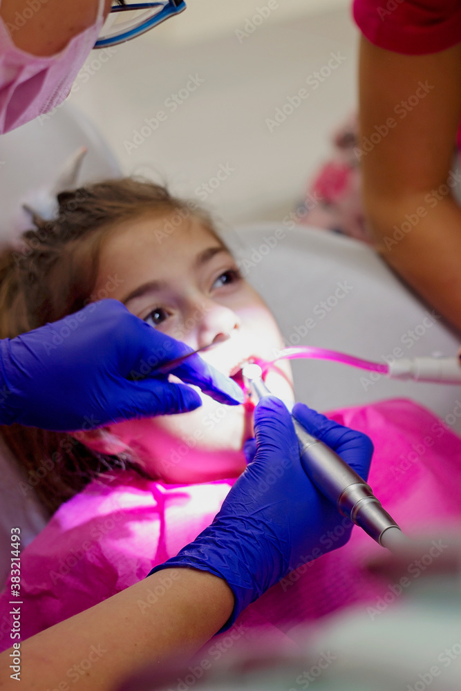 Little girl at dentist's appointment. Candid picture of inspection and tooth being treated