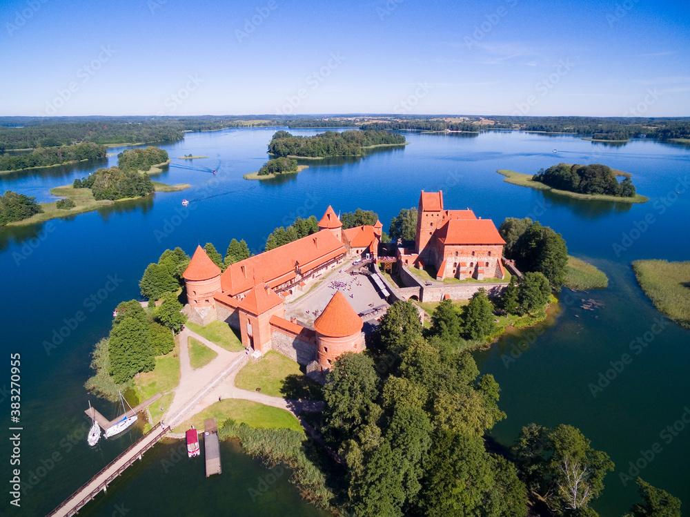 Aerial view of beautiful Gothic style red brick castle on an island on Galve Lake, Trakai, Lithuania