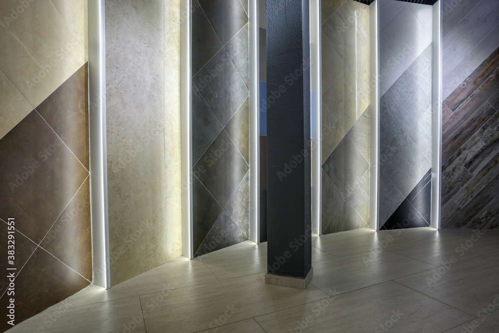 rows of ceramic tiles and natural stone inside of interior modern showroom shop
