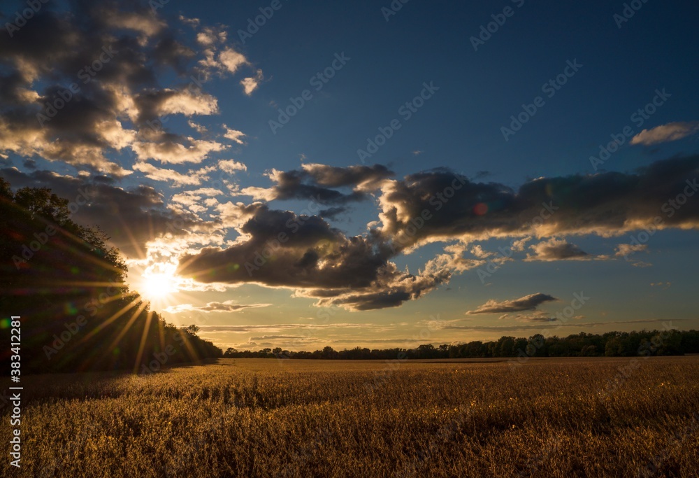 This idyllic landscape photo shows a glowing sun setting over scenic farm land and illuminating the sky, trees, and surroundings.
