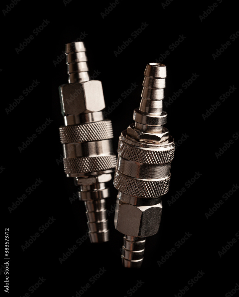 Modern with levitating metal pneumatic fittings, auto parts for concept design on black isolated background
