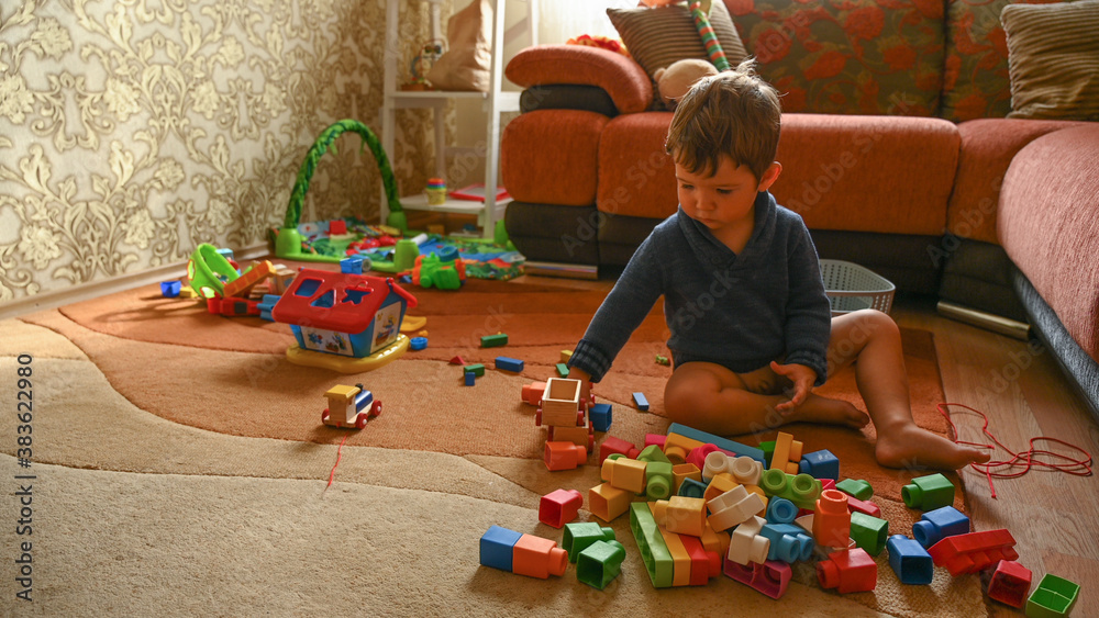 Child playing with toys while sitting on the carpet