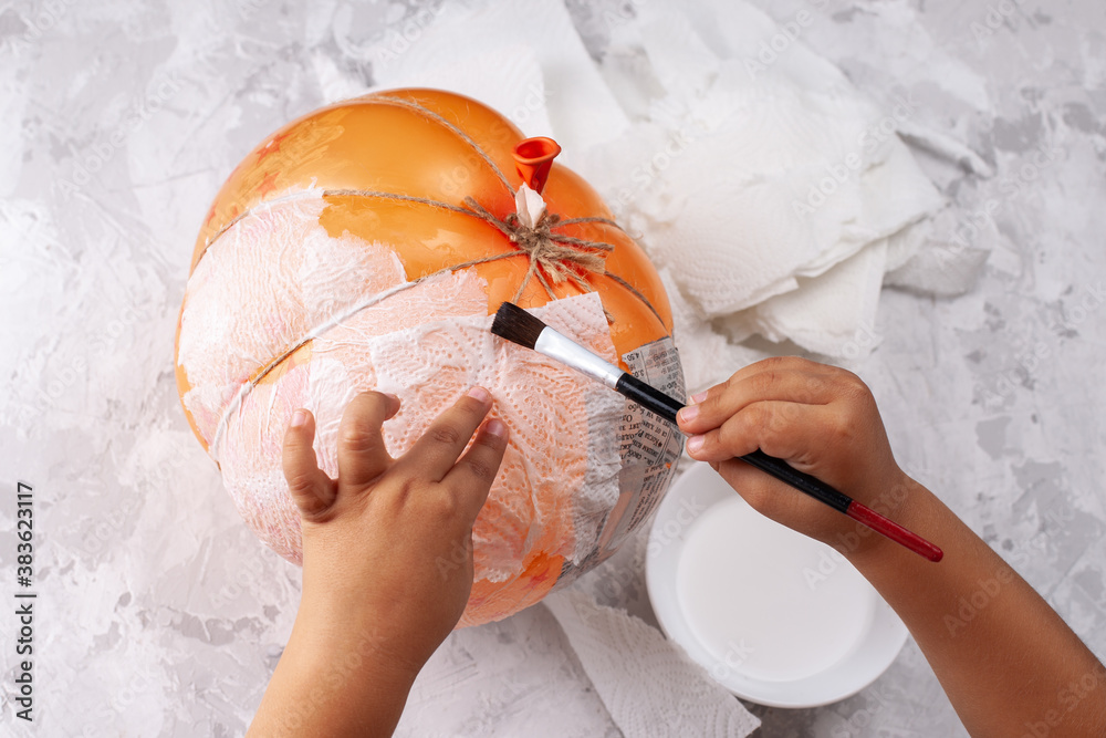 baby's hands makes a papier-mache pumpkin from a balloon, DIY for Halloween in isolation.