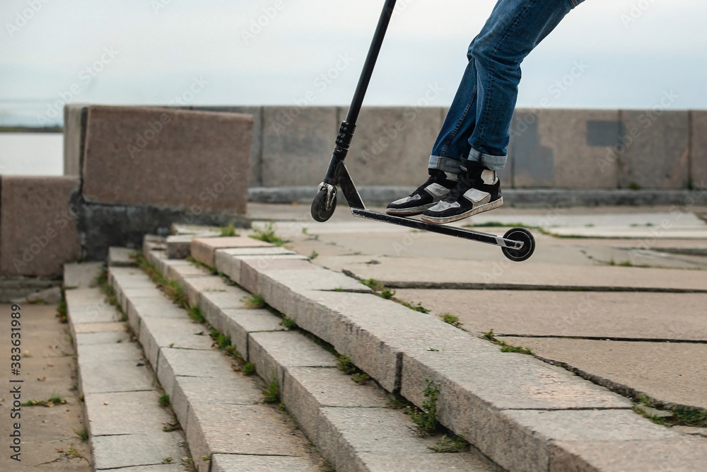 Boy on scooter makes a trick and enjoying his riding by skate in the city street.