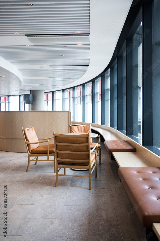 Brown leather chairs office meeting space modern work space large windows natural light collaboration together learn