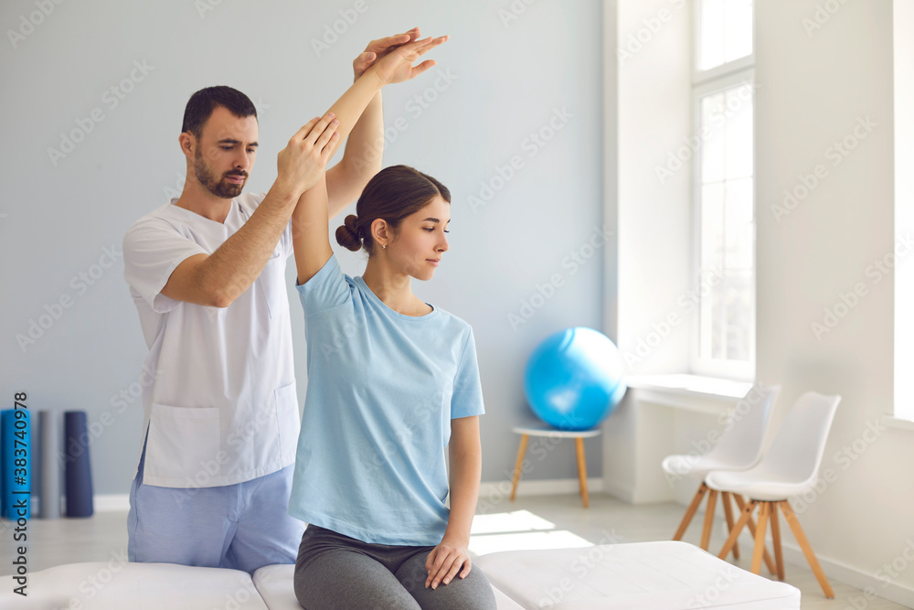Licensed chiropractor or physiotherapist examining young woman's arm in modern clinic