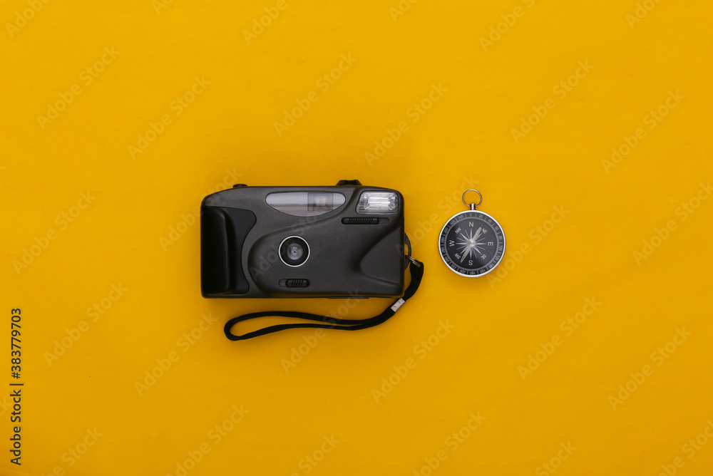 Compass and camera on a yellow background. Top view. Minimalism travel concept. Flat lay