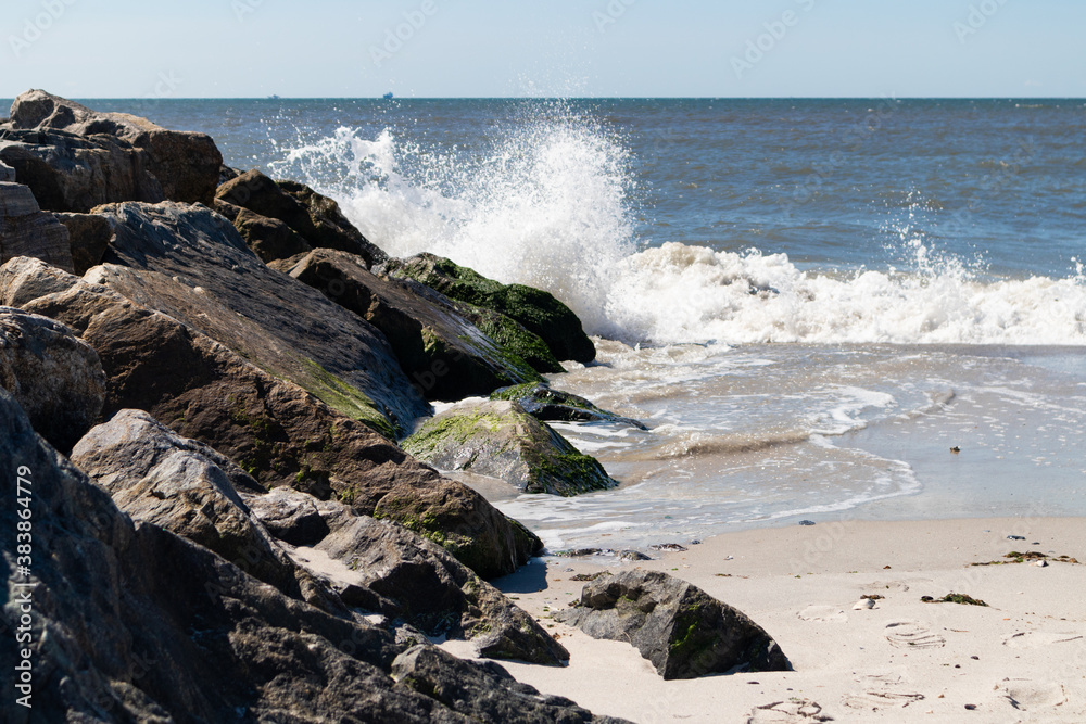 Shore of Long Beach New York along the Atlantic Ocean with Rocks and Waves