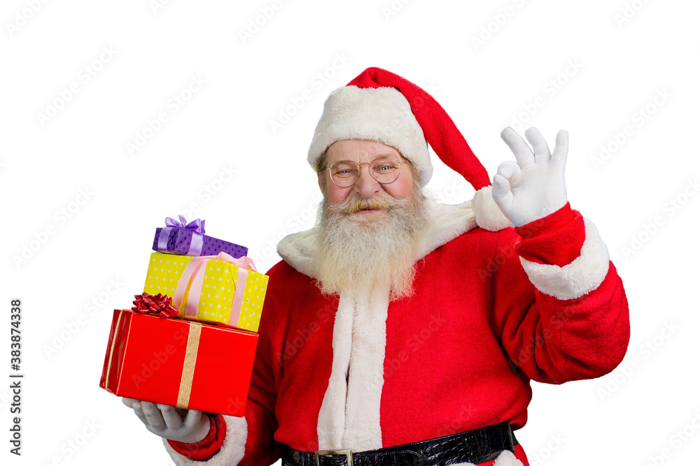 Portrait of Santa with gift boxes. Photo of realistic Santa Claus showing okey sign standing on white background. Santa Claus with Christmas presents.