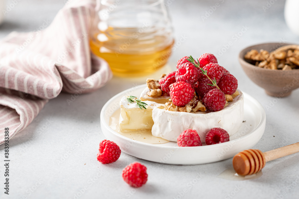 sliced brie cheese with raspberries, honey and walnuts . Selective focus, white background