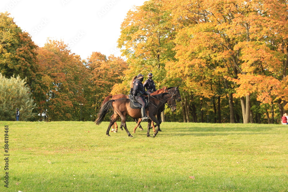 Three mounted policemen in Kolomenskoye Park. Russian police officers in black medical masks.