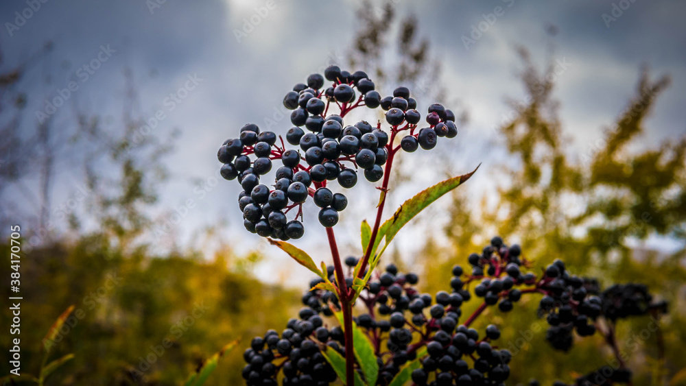 Ripe elderberry branch,elderberry plantation, black elderberry.
