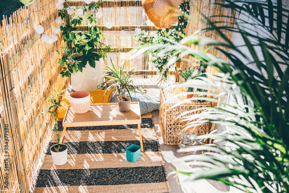 Eco friendly bamboo terrace. Orange pillows on the floor.