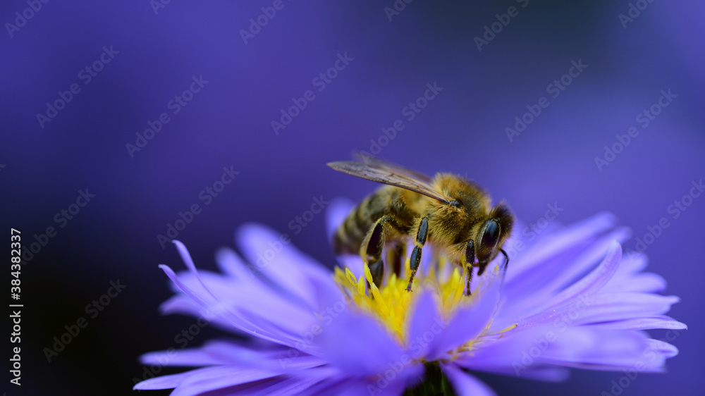 Close up of a honey bee on a purple flowering aster, against a purple background