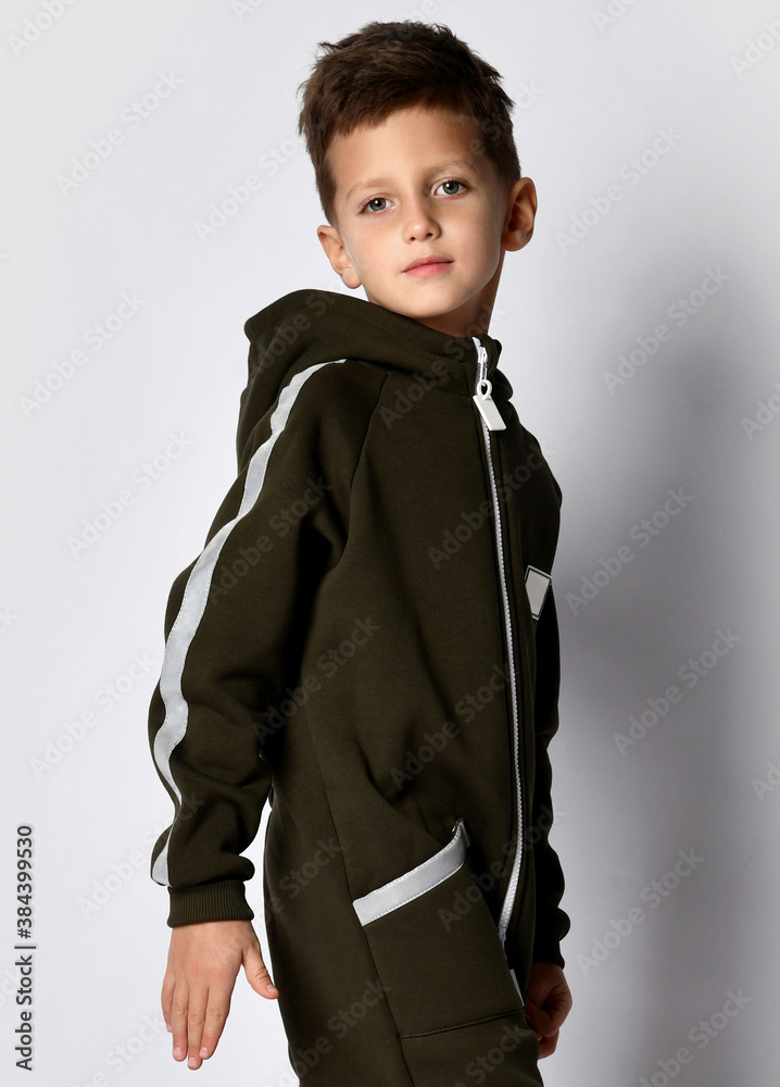boy advertises a fashionable sports model for children posing for the camera in a warm overalls against the background of a studio wall.