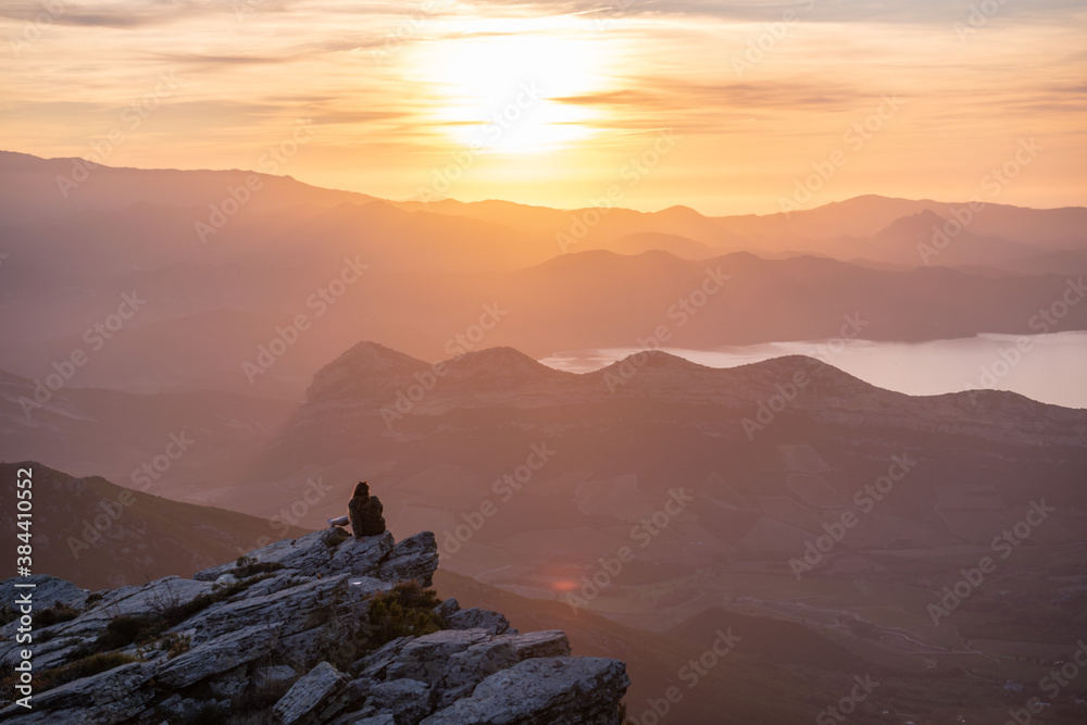 Young woman enjoying beautiful sunset scenery from the peak of a mountain