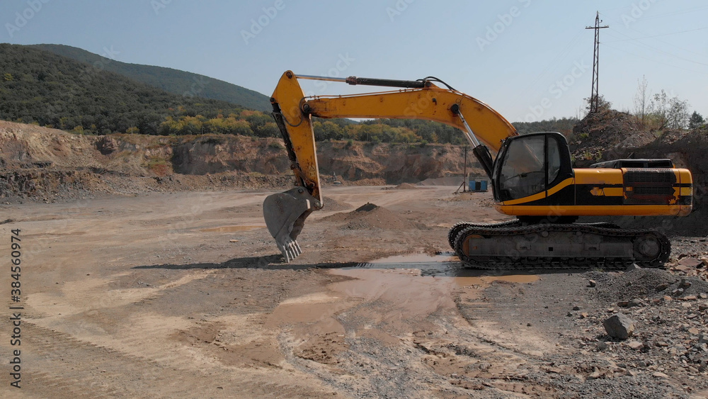 Yellow digger machine. Excavator with a shovel for digging. Sand and mud everywhere.