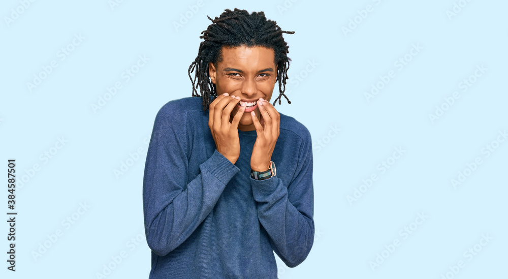 Young african american man wearing casual winter sweater laughing and embarrassed giggle covering mouth with hands, gossip and scandal concept
