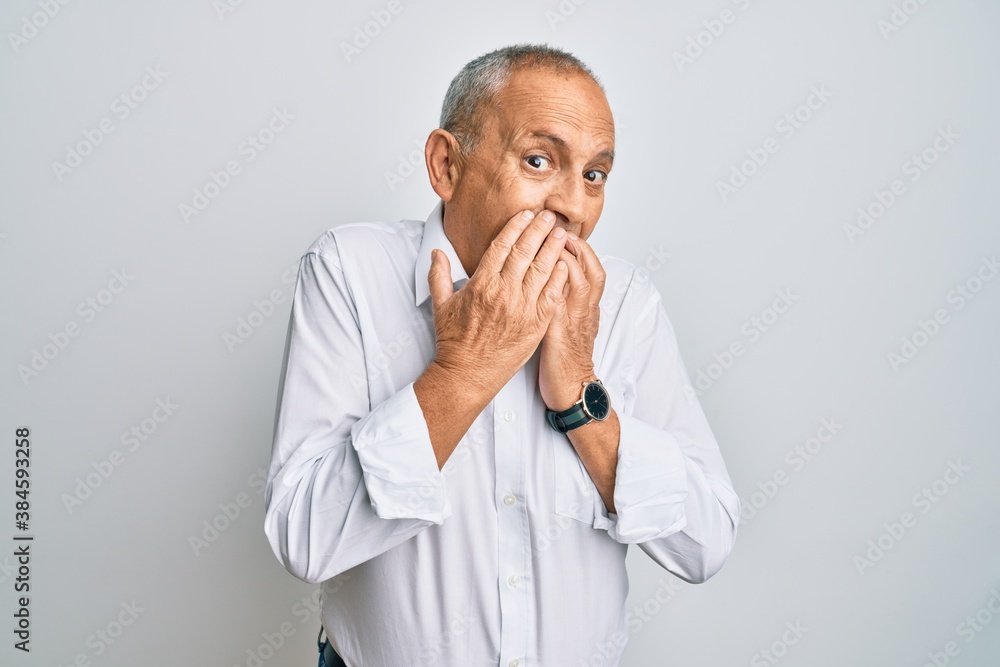 Handsome senior man wearing casual white shirt laughing and embarrassed giggle covering mouth with hands, gossip and scandal concept