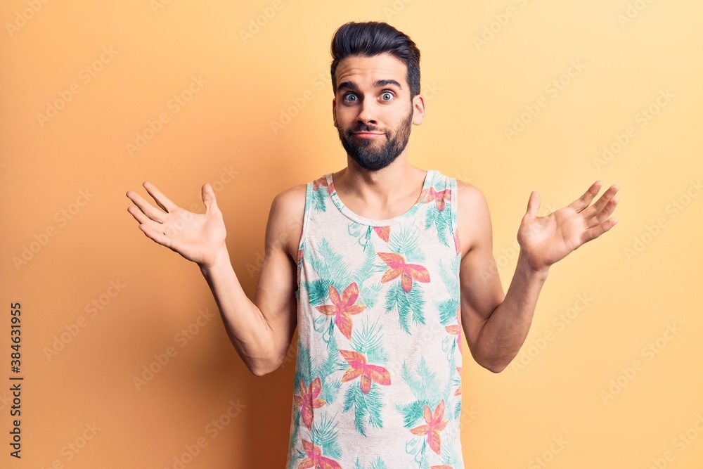 Young handsome man with beard wearing summer sleeveless t-shirt clueless and confused with open arms, no idea and doubtful face.