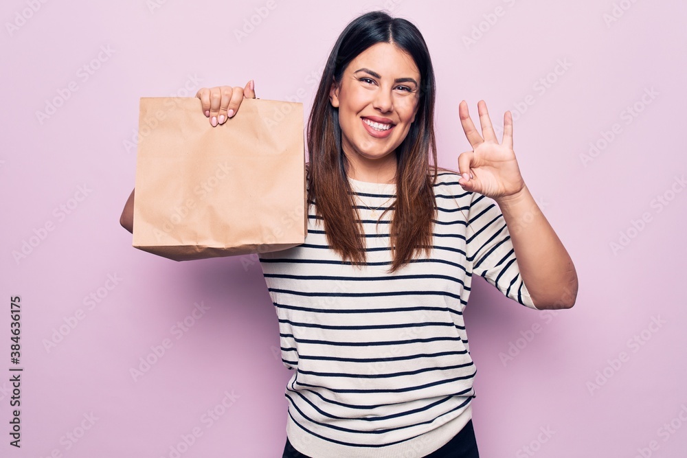 Young beautiful woman holding deliver paper bag with takeaway food over pink background doing ok sign with fingers, smiling friendly gesturing excellent symbol