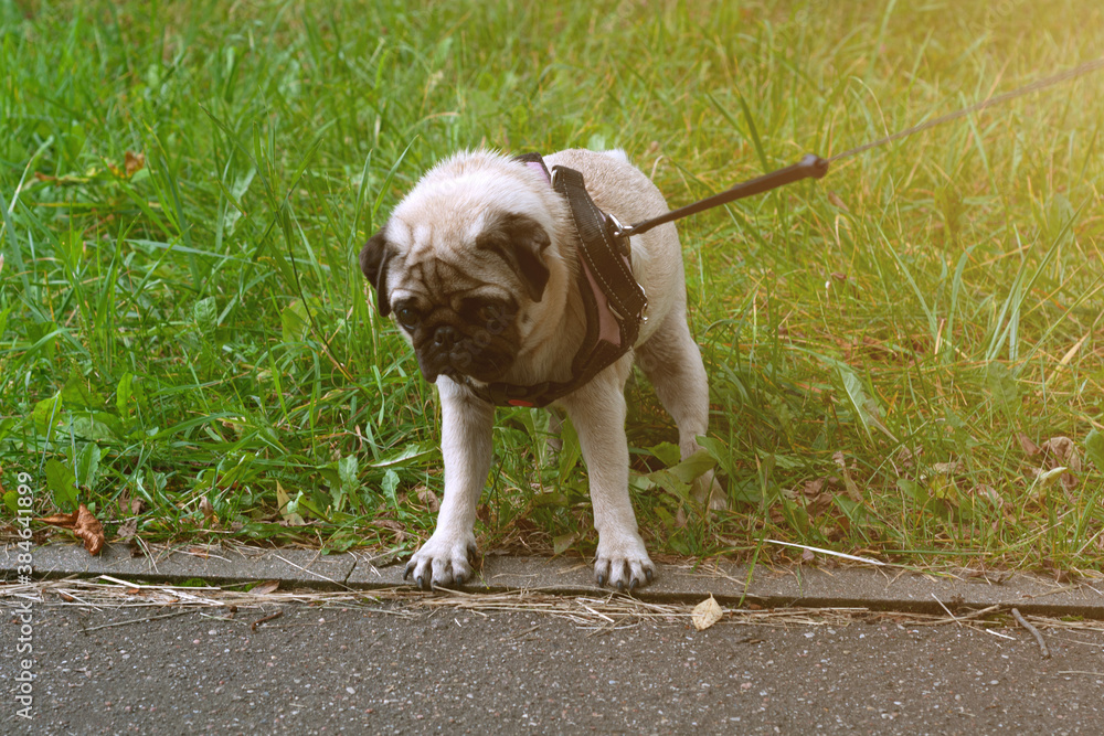 Dog lagging behind refuses to walk and drags leash in opposite way