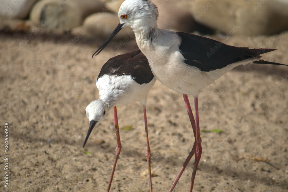 Zwei Stelzenläufer auf Sandboden im Zoo