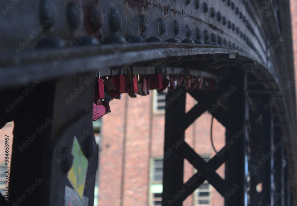 Eiserne Brücke in Hamburger Speicherstadt mit Liebesschlössern vor alten Backsteinbauwerken