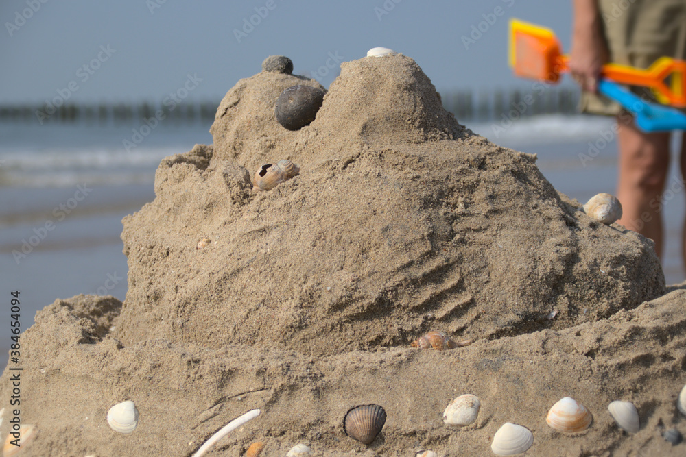 Sandburg am Strand vor blauem Himmel mit Menschen im Hintergrund mit Strandschaufeln